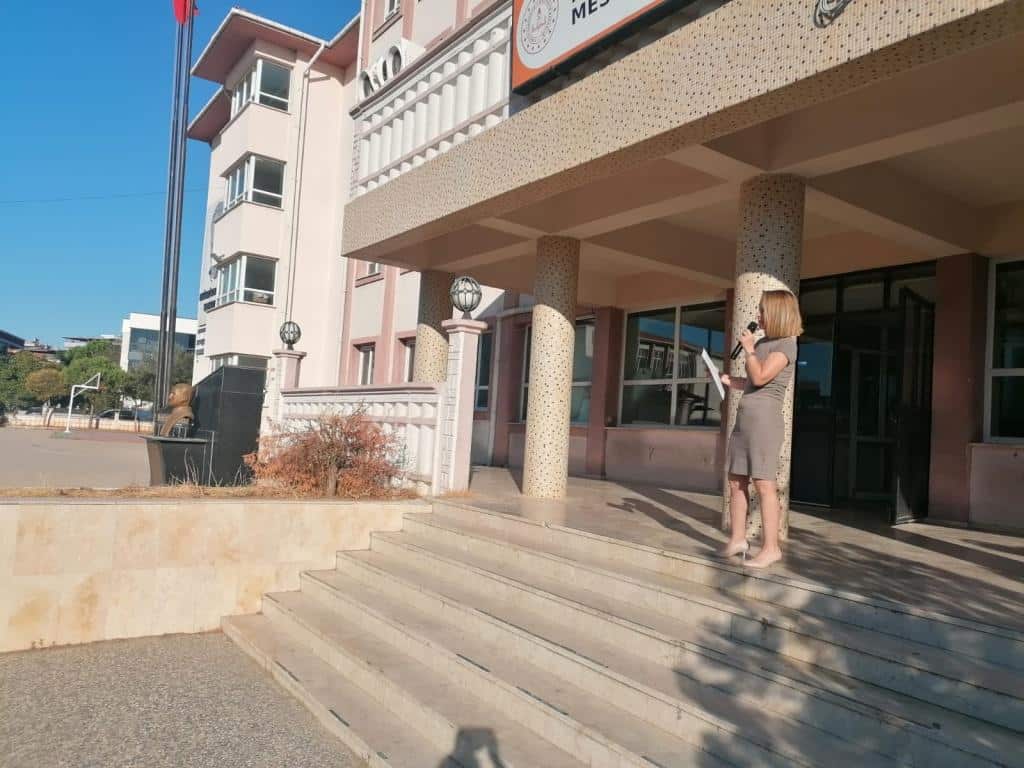 İstiklal Marşı'nın okunmasıyla başlayan törende okul müdürümüz Belma TANER de bir konuşma yaptı. Konuşmasında eğitimin en vazgeçilmez bir hizmet olduğuna inancı ve her şeyin insanı sevmekle başladığının bilincinde olduğunu belirten Taner, Menderes Belediyesi MTAL’nin idareci ve öğretmenleri olarak; hayata gülümseyen, mesleğini benimseyen, görevini önemseyen eğitim kadrosuyla gençlerimizi; eğitimin, bilimin öngördüğü kurallar ve koşullar içinde; sevgi, saygı ve hoşgörüye dayalı bir ciddiyetle, yeteneklerinin el verdiği en üstün başarıya ulaştıracaklarına inanç ve güvenlerinin tam olduğunu söyledi.